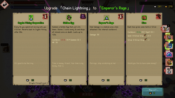 Her yükseltme, sizi pısırıklıktan kahramana götüren şey olabilir! Beceri seçimlerinizi yeniden düzenlemek için altın harcayın! Oh, ve ilerledikçe koşularınızı kolaylaştırmak için yetenek puanları şeklinde meta ilerleme kazanın!