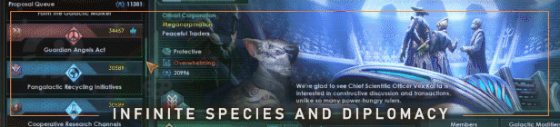 Yıldızlar arasında yolculuk ederken çok sayıda türü keşfetmeye, keşfetmeye ve onlarla etkileşim kurmaya hazır olun. İnşaat gemileri yeni keşfedilen gezegenlerin etrafında istasyonlar inşa ederken araştırma ve keşif için bilim gemileri göndererek galaktik bir imparatorluk kurun. Kaşifleriniz için sınırlamalar ve evrimler yaratarak toplumunuz için bir yön çizerken gömülü hazineleri ve galaktik harikaları keşfedin. İttifaklar kurulacak ve savaşlar ilan edilecek.